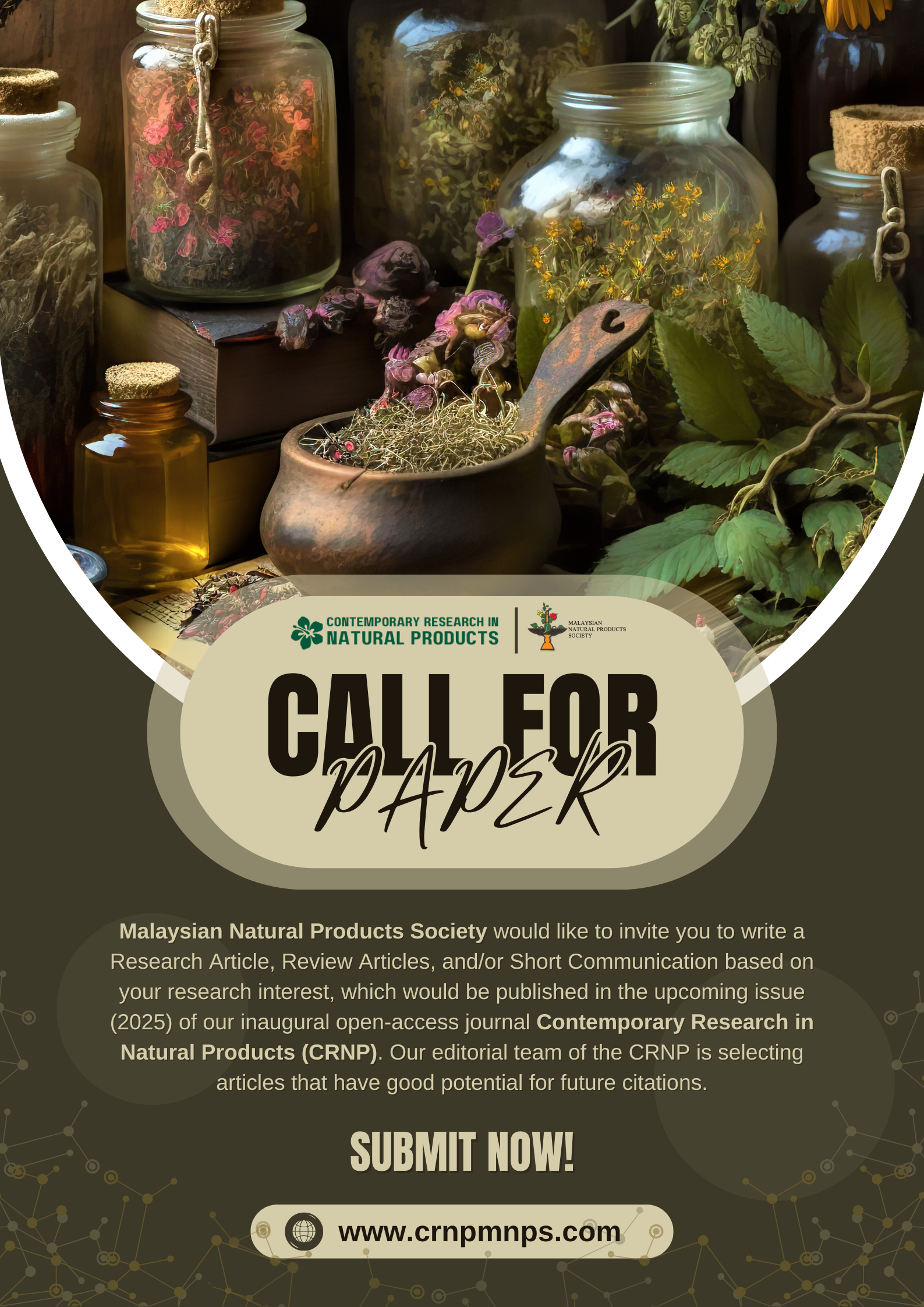 Contemporary Research in Natural Products (CRNP) is the official open-access journal of the Malaysian Society of Natural Products (MNPS), dedicated to sharing knowledge and documenting information which will potentially be of value towards application of natural products as medicine, nutraceuticals, cosmeceuticals, aroma chemicals, and agrochemicals. The journal publishes original scholarly contributions in natural products research, focusing on substances derived from terrestrial and marine plants, microbes, and animals. It considers interdisciplinary articles that explore the chemistry, biology, biochemistry and preclinical pharmacology of natural products, utilizing contemporary methods and approaches in the relevant fields. Critical reviews, full research papers, and short communications are welcomed.